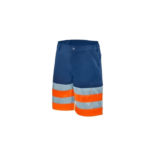 BERMUDA-HOSE HiVIS Construction: EN-zertifiziert. Hoch sichtbar (High Visibility). Dehnbarer Bund mit 6 Gürtelschlaufen. Jeans-Knopf. Hosenschlitz mit Zip. Seitentaschen, Schenkeltasche mit Patte und Druckknöpfen. Werkzeugtasche. Zwei Gesäßtaschen mit Patte und Druckknopf. Zweifaches 3M-Reflektorband am Hosenbein.
