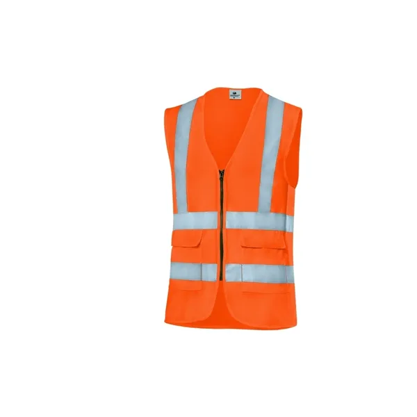 WARNWESTE HiVIS Construction: EN-zertifiziert. Reißverschluss an der vorderen Mitte, Vordertaschen mit Patte und Kletter. 3M Reflektorband an der Taille und über der Schulter